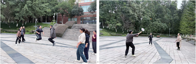 活动伊始,在刘晓丽老师的带领下,大家整齐列队,共同进行八段锦集体练习。伴随着舒缓的节奏,教职工们舒展筋骨、调节呼吸,为接下来的活动做好充分热身。随后进行的跳长绳环节节奏明快、互动热烈,大家依次轻盈跃入绳中,动作协调、配合默契,展现出良好的身体素质和团队协作精神。活动现场也准备了充足的饮用水,方便教职工在运动间隙及时补充水分。